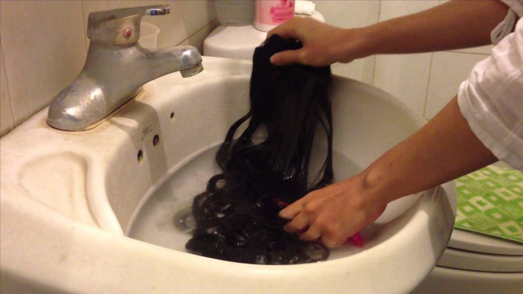 – Cho tóc giả sau khi được gỡ rối và chải mượt vào chậu ngâm khoảng từ 5 đến 10 phút (chỉ ngâm không được dùng tay vò tóc, vì vò sẽ làm tóc rối tung lên đó).